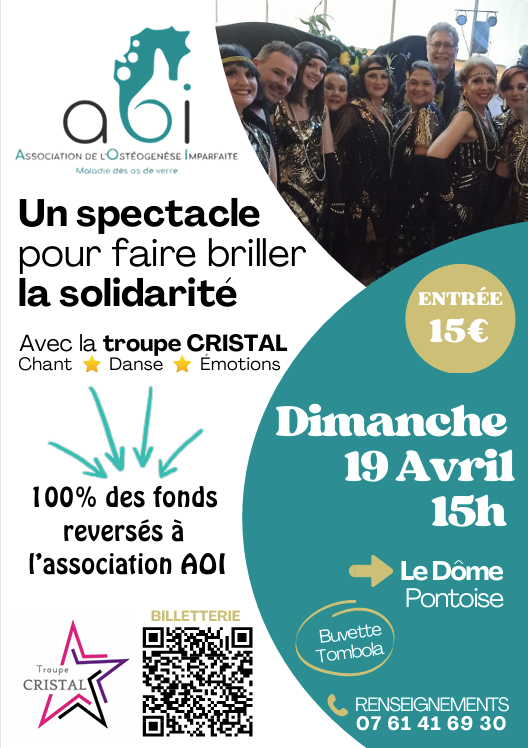 La troupe CRISTAL - composée d’une quinzaine d’artistes - vous invite à un spectacle exceptionnel de chansons de variétés chorégraphiées et costumées. au profit de l’Association de l’Ostéogenèse Imparfaite (AOI), qui accompagne les personnes atteintes de la maladie des os de verre.